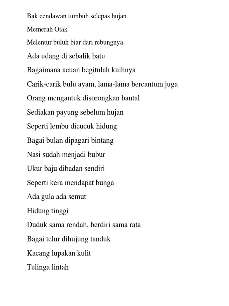 Previous Post Sebelumnya bak bujang setahun sudah betetak bak gadis setahun sudah memanjangkan gombak. Bak cendawan tumbuh selepas hujan. Kata sepakat yang dicapai dalam mesyuarat.